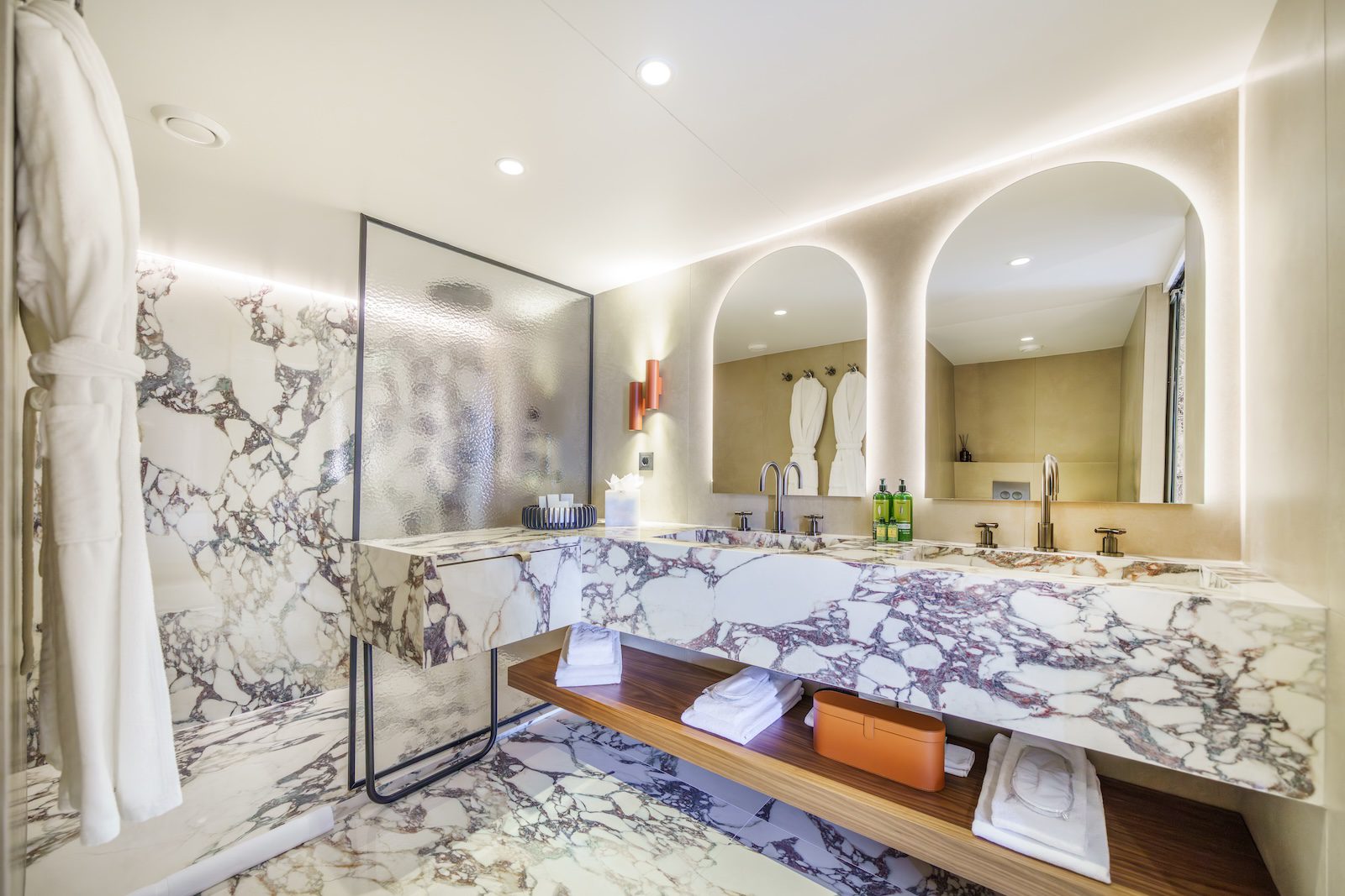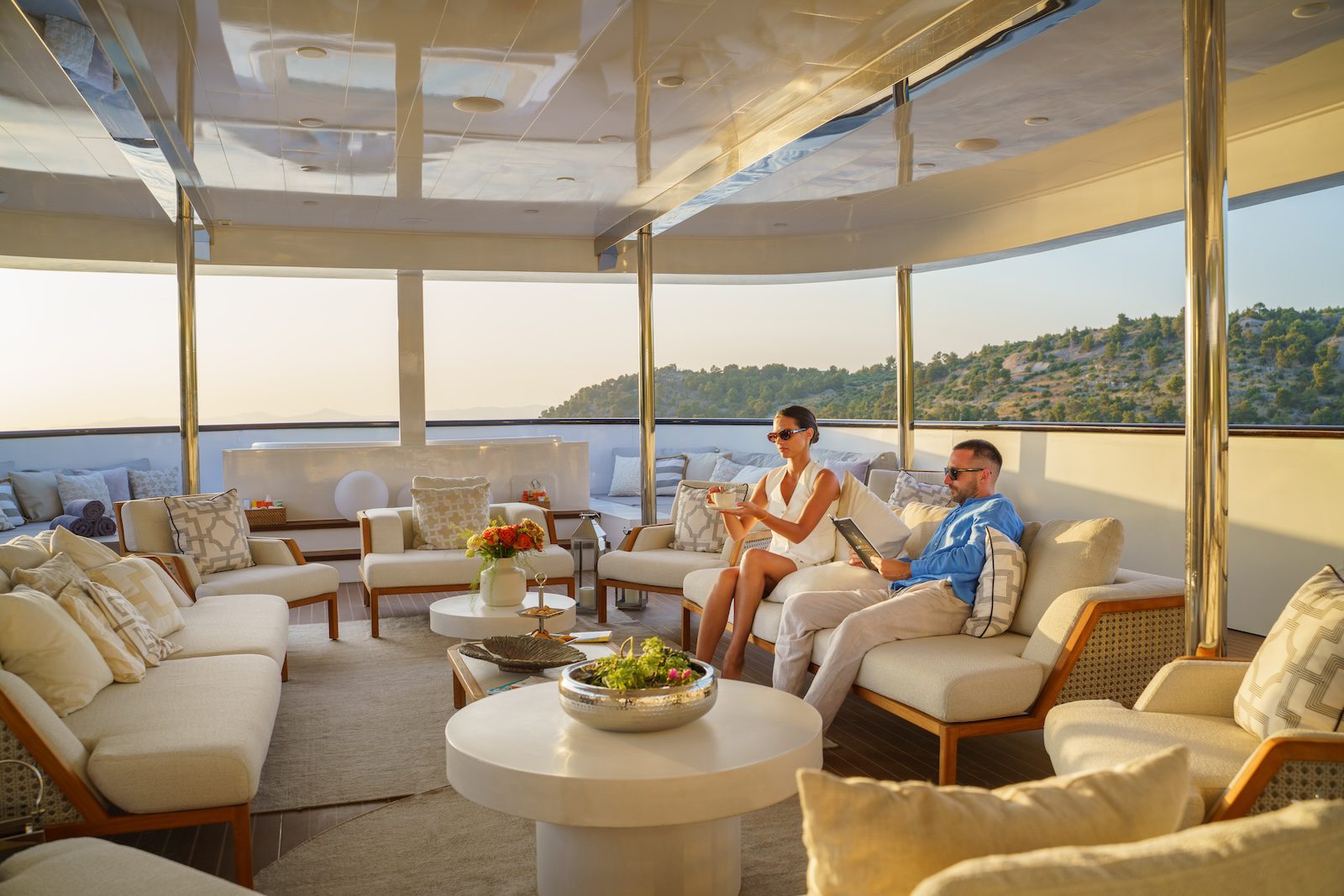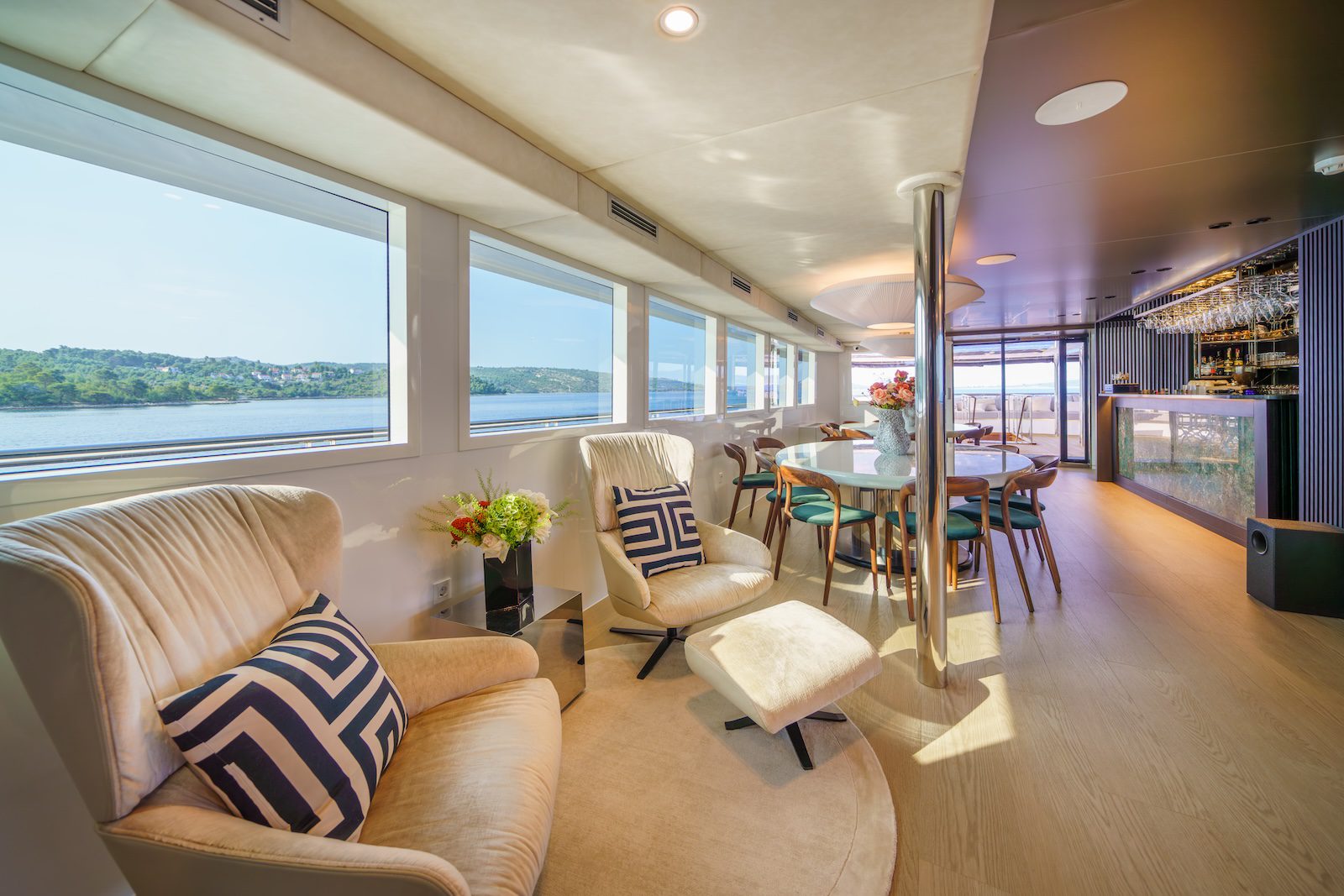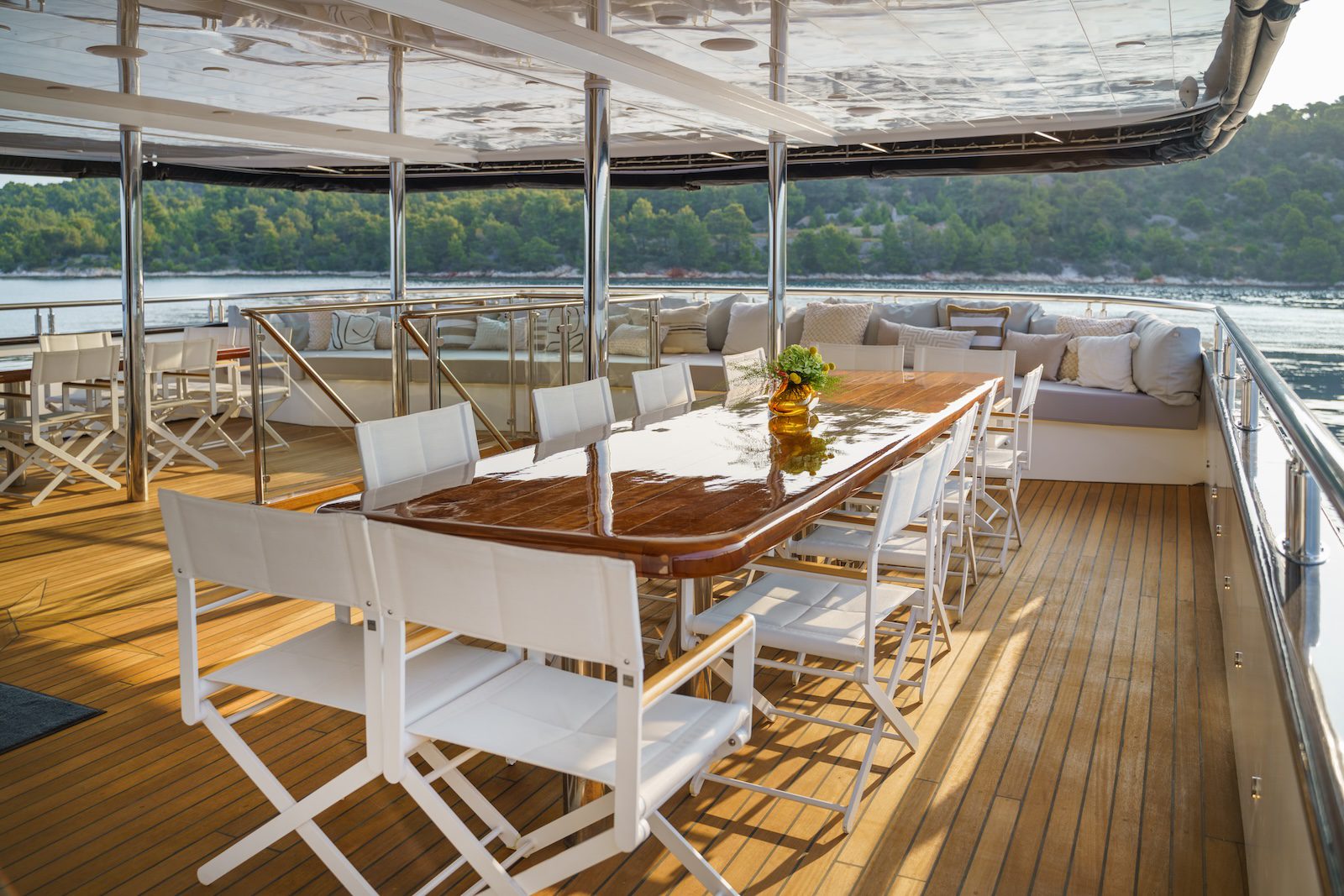 Top deck, also called the “sun deck” offers 155 m2 (500 sq ft) of space and is equipped with sunloungers. WIFI is free of charge and available in the salon and in the rear part of the boat. On both the Main deck and the Upper deck there is one public bathroom with shower.