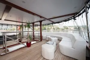 On the highest deck is a Sun Deck that covers 340sqm with sun-beds for passengers, while part of the sun deck is shaded for clients’ comfort. Here you can enjoy our Elegance Rooftop Jacuzzi designed to ensure an unforgettable cruise.
